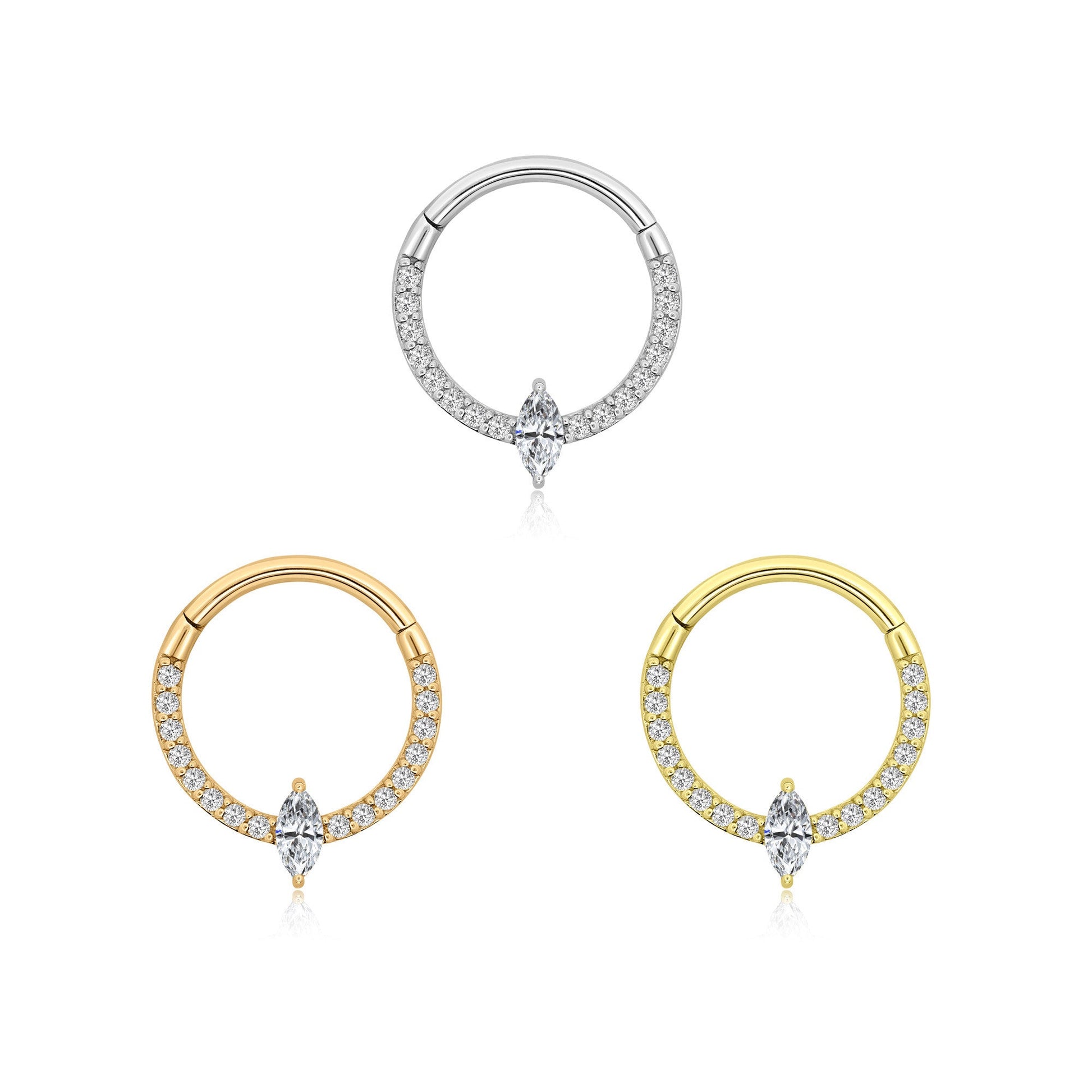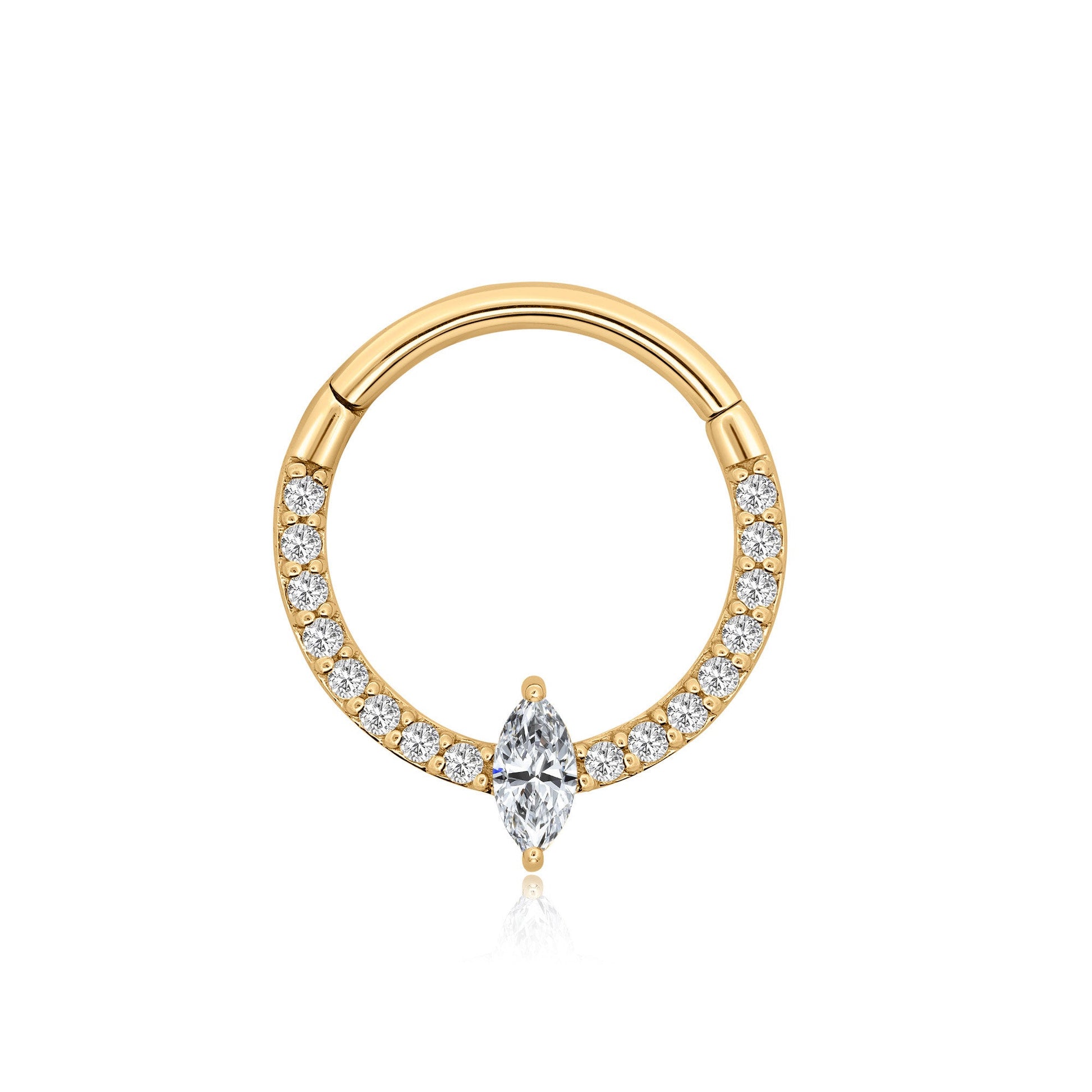 Classic brilliance meets refined elegance in the Bella Clicker. Designed with a top-facing profile, this timeless 16-gauge piece features a half-circle of meticulously set clear CZs, crowned at the center with a radiant marquise-cut CZ. The result is a harmonious blend of sparkle and sophistication—perfect for adding a touch of glamour to any piercing.
