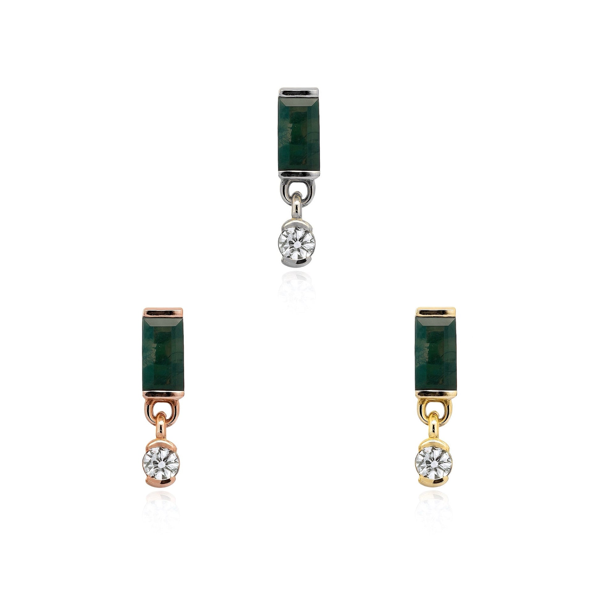 Fresh and luminous, Dewdrop Moss captures a moment of quiet beauty found in nature’s smallest details. A 4 x 2 mm baguette-cut moss agate anchors the design, its deep green inclusions reminiscent of shaded forest paths. Suspended below, a single round clear CZ glimmers like a dewdrop, adding gentle movement and light-catching contrast.