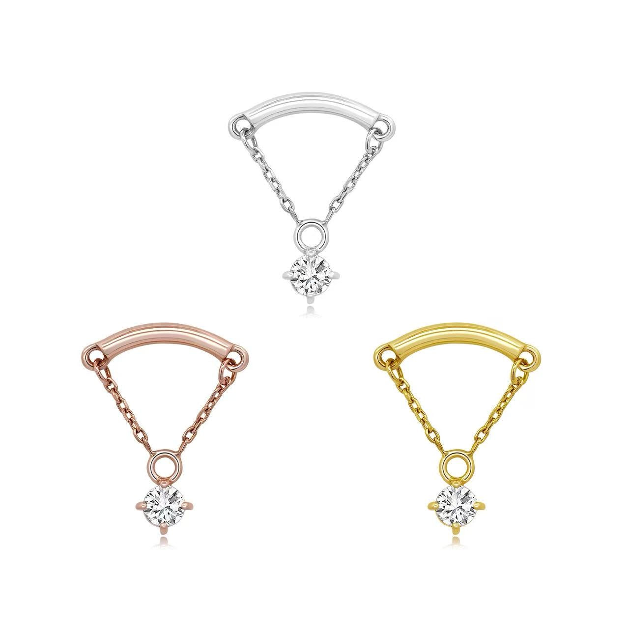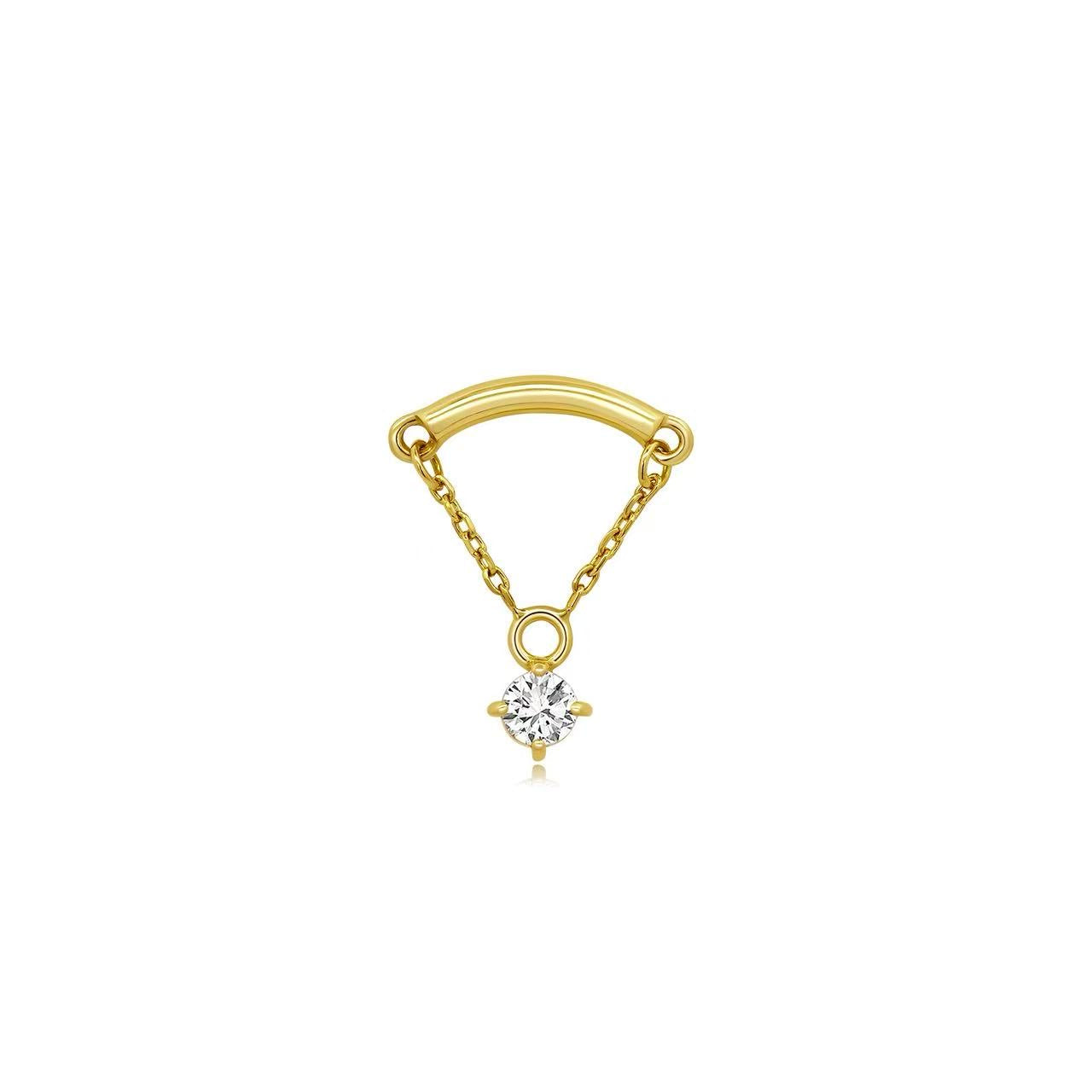 Sleek and celestial, Elara is a tribute to refined minimalism with a touch of brilliance. Designed in a graceful 7mm arc, this piece features a luminous 2.5mm prong-set high-grade CZ at its center, delicately suspended between two 7mm fine gold chains. The result is a floating effect that evokes both lightness and intention—perfect for hidden helix placements or as a subtle statement in any ear constellation.